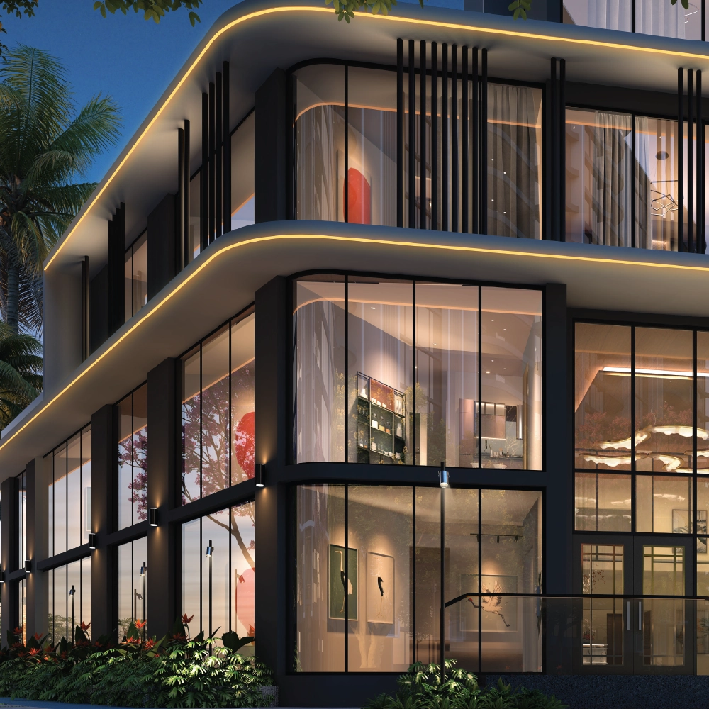 Singapore-styled elevation with stunning glass facade lighting and beautifully landscaped surroundings